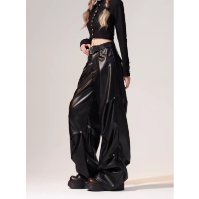 黑色设计感加绒pu皮阔腿裤女2025年冬季新款小个子高腰显瘦拖地裤