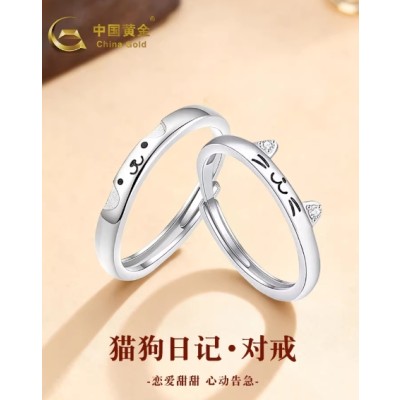 中国黄金纯银小猫小狗情侣对戒足银戒指一对小众情人节礼物送女友