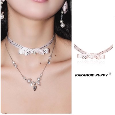 波点控miu系!原创小众绸缎蝴蝶结少女珍珠项链双层毛衣链