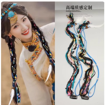 藏族编发渐变彩色头绳民族风小众毛线长款飘带发夹绑发麻花辫发绳