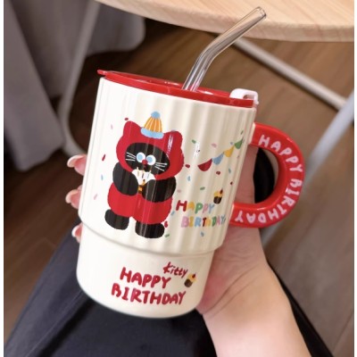 吸管杯子马克杯带盖高颜值水杯女可爱家用办公室咖啡早餐杯陶瓷杯