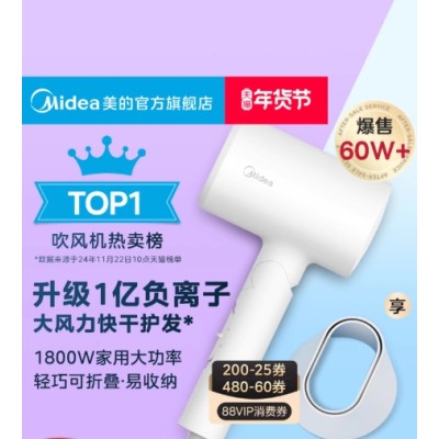 美的电吹风机家用负离子大风力护发速干大功率吹风筒折叠宿舍学生