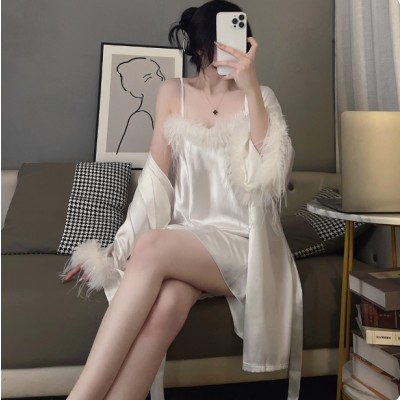 冰丝睡衣女性感吊带睡裙春秋季长袖薄款毛绒纯欲风家居服睡袍套装