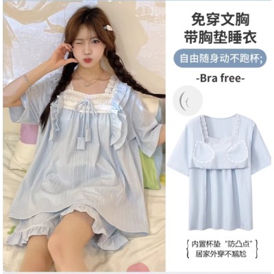 夏季睡衣女士带胸垫纯棉短袖短裤夏天薄款精梳棉家居服可外穿套装