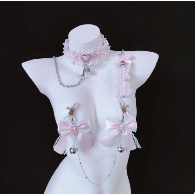 sm粉色蕾丝铃铛套装项圈牵引调情趣用品调教咪咪夹乳夹k9调教道具