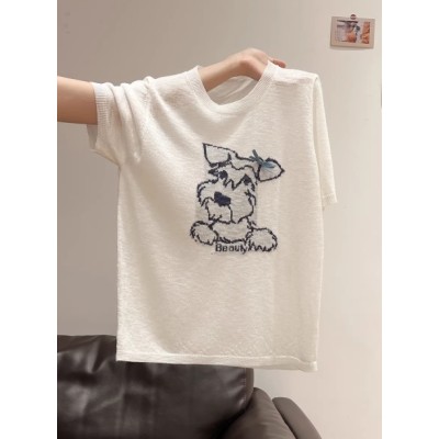 夏季新款白色卡通小狗绣花圆领毛针织衫女装2026韩系薄款短袖T恤