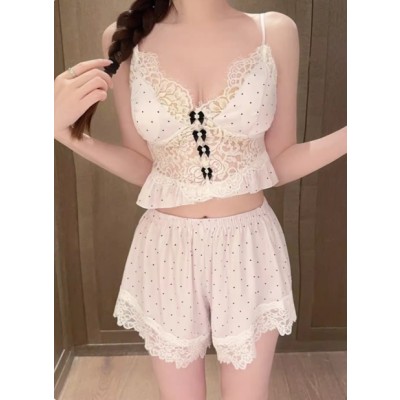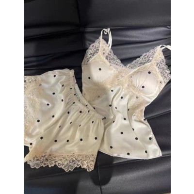 纯欲风蕾丝镂空波点冰丝睡衣女新款带胸垫性感深V吊带短裤家居服