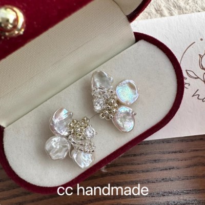 cc手作 原创设计 天然珍珠花瓣s925银锆石鸢尾耳钉耳夹耳环 自留