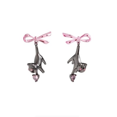 Esakoochi漂亮的小猫~原创设计小众耳饰黑猫粉色蝴蝶结耳环女