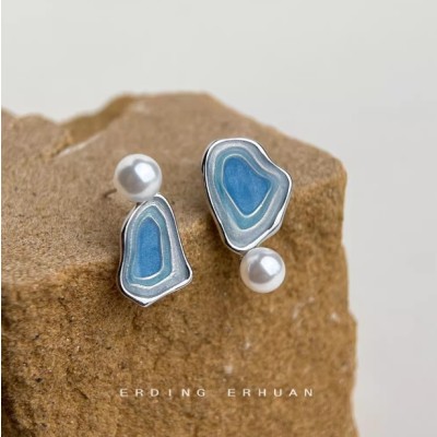 蓝色夸张绝美耳夹无耳洞蚊香盘S925银针珍珠珐琅适合夏天的耳饰女