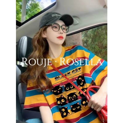 法国Rouje Rosella⭐复古条纹短袖t恤女撞色设计小众卡通印花上衣
