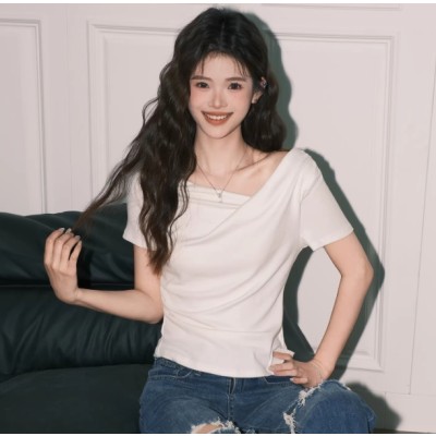 it:CHOCOOLATE 韩系ins白色荡领T恤小衫女不规则收腰修身短袖上衣