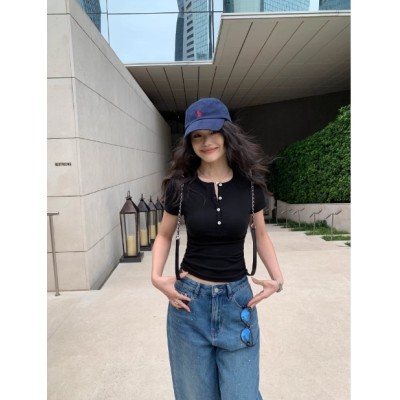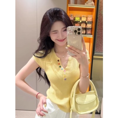 韩版多巴胺纽扣v领针织短袖T恤女夏小香风设计感气质显瘦别致上衣