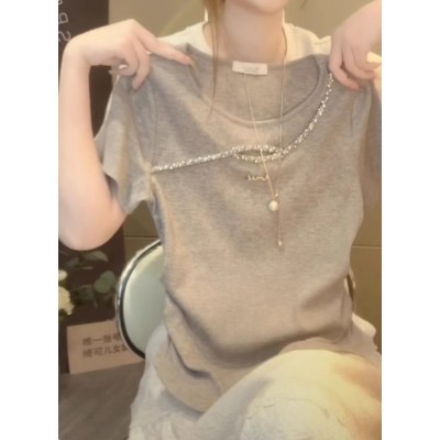 欧货高级感灰色烫钻镂空短袖T恤女夏季时髦洋气漂亮独特显瘦上衣