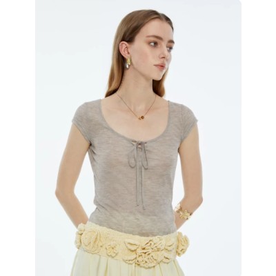 1Mirro天丝羊毛夏季法式圆领正肩短袖T恤女u领打底衫修身显瘦上衣