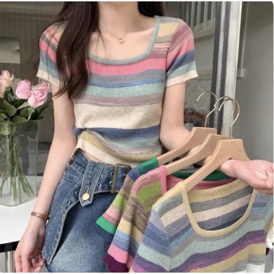 韩国彩虹条纹方领短袖t恤女春夏新款正肩多巴胺冰丝针织短款上衣