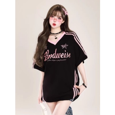 美式复古潮流撞色拼接v领宽松短袖t恤女夏季oversize休闲半袖上衣