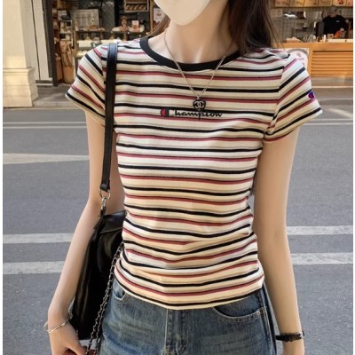 日版潮牌冠军夏季修身显瘦正肩条纹短袖t恤女设计感撞色体恤上衣