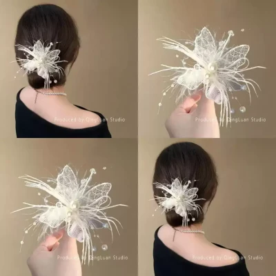 欲望蝴蝶~纯欲风羽毛珍珠蝴蝶发夹女2025年新款马尾发卡旅行发饰