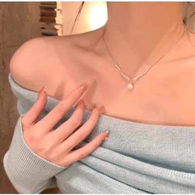 气质闪锆波浪珍珠吊坠锁骨链高级感轻奢小众项链女毛衣链颈链配饰