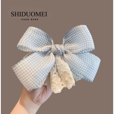 韩系格纹蓝色蝴蝶结发夹小清新超仙蕾丝小裙摆顶夹半扎发横夹发卡