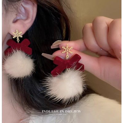 毛绒红色耳环2025新款爆款高级感秋冬蝴蝶结过年新年喜庆耳饰钉