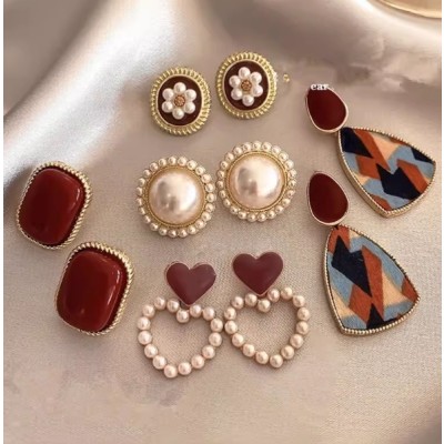 2026新款爆款高级感s925耳钉酒红复古港风耳夹女气质珍珠耳环套装