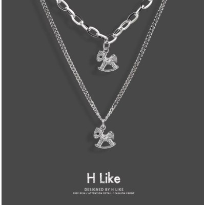 水钻小马时尚项链吊坠饰品钛钢个性短款双层叠加链毛衣链男女潮酷