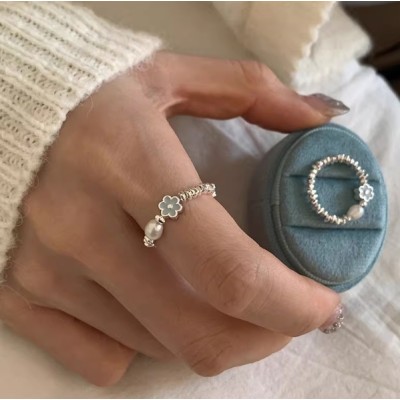 饰尚e族蓝色滴釉花朵珍珠碎银子戒指女轻奢时尚百搭气质S925镀银