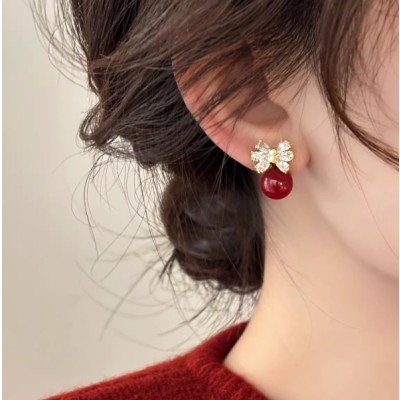 蝴蝶结红色锆石耳钉2025新爆款耳夹高级纯银耳饰小众气质珍珠耳环