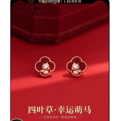 999纯银针四叶草马年耳钉女本命年耳环小众高级秋冬红色过年耳饰