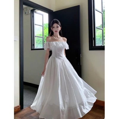 2025夏季白色气质荷叶边飞飞袖礼服长裙收腰显瘦a字漂亮连衣裙女
