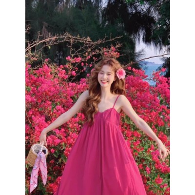 多巴胺甜美气质宽松高腰吊带连衣裙女夏三亚旅游海边度假沙滩长裙