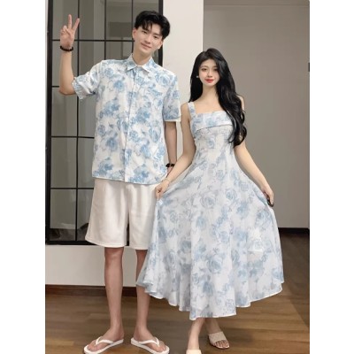 海边沙滩度假情侣装夏季浅蓝色碎花显瘦吊带连衣裙法式一裙一衣潮