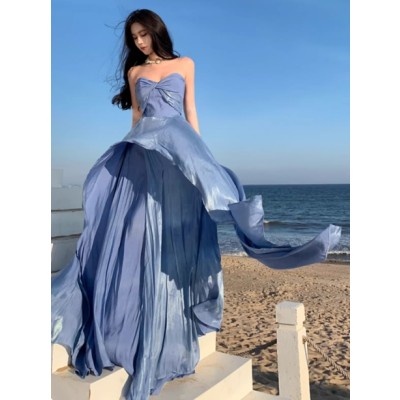 高级感飘逸女神蓝色抹胸连衣裙法式气质轻奢拍照礼服度假拖尾长裙