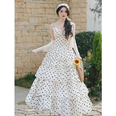 法式三亚度假复古波点层层蛋糕印花吊带裙云南旅游穿搭连衣裙套装