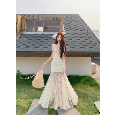 设计感重工花朵蕾丝拼接吊带长裙连衣裙女夏季海边度假风气质裙子