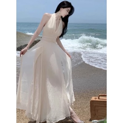 VENUIE 法式挂脖露背连衣裙女高级感沙滩长款海边度假绝美吊带裙