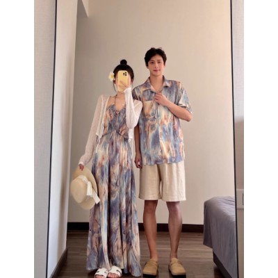 法式情侣装夏季新款度假风沙滩海边吊带女连衣裙旅游宽松一裙一衣