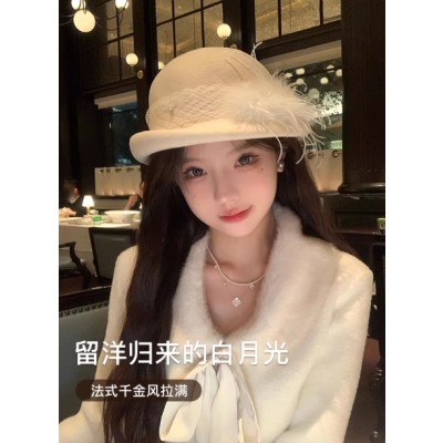 暖冬白月光~法式千金羽毛卷边礼帽女冬季优雅白色羊毛呢渔夫帽子