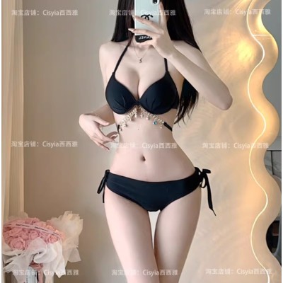 爆款黑色性感小胸聚拢加厚带钢托钻链比基尼度假温泉三件套泳衣女