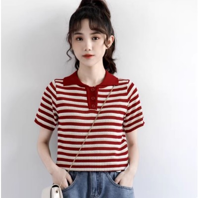 韩国夏季新款镂空薄款冰丝针织衫女短袖polo领T恤红条纹短款上衣