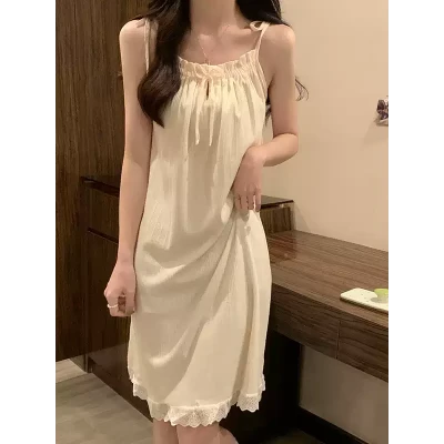 吊带睡裙女夏季款纯棉法式性感带胸垫宫廷风杏色家居服睡衣裙夏天