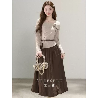 芝士鹿法式设计感显瘦方领上衣搭配半身裙女秋季美拉德穿搭一整套