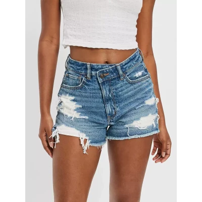 AEO 美国鹰夏季新款蓝色高腰无弹修身显瘦磨破洞毛边牛仔短裤女潮