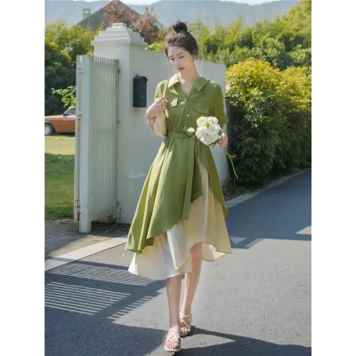 夏季新款polo领连衣裙女学院风减龄不规则下摆长裙子