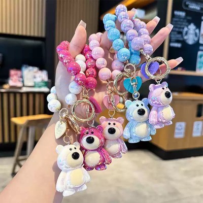 网红炫彩小熊串珠钥匙扣卡通可爱草莓熊钥匙链情侣手机包包小挂饰