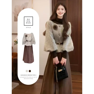 早秋冬日气质一整套ootd穿搭配小香风连衣裙子两件套装女