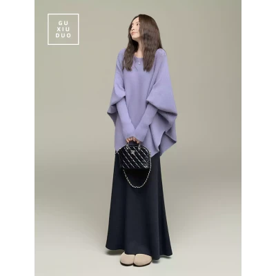 绝美巨好看的轻熟韩系早初秋冬季紫色斗篷蝙蝠袖针织杉毛衣上衣女