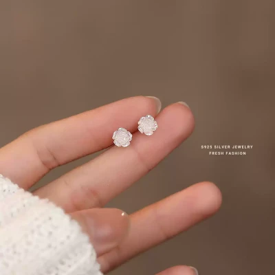 纯银清冷幻彩白玫瑰耳钉女法式复古轻奢气质甜美养耳洞耳饰
